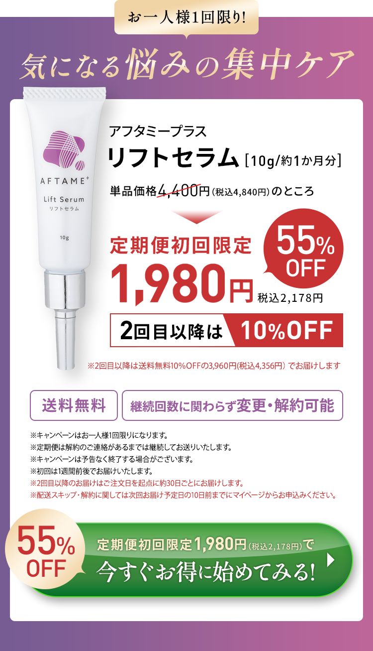 また、アフターミープラスリフトセラムは初回特別価格55%オフ・単品価格より2,662円(税込)OFFでお試しすることができます。
