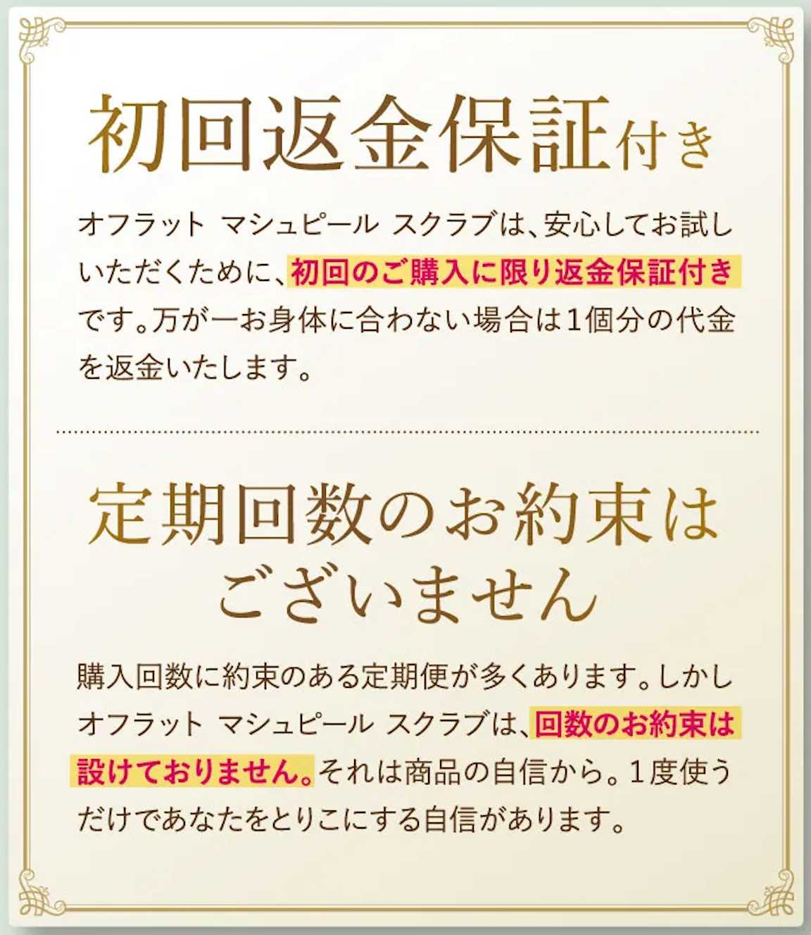 「購入回数の縛りがある定期便が多い中、オフラットは回数のお約束を設けていません。それは商品の自信から。1度使うだけであなたをとりこにする自信があります。」と公式サイトでも明言されているほどです。